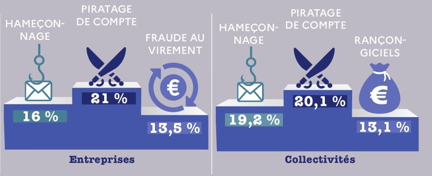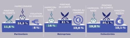 Le hameçonnage figure au premier rang des menaces, tous publics confondus, en augmentation de 70%. Le piratage de comptes en ligne est en tête des menaces touchant les professionnel·le·s, en hausse de 45% par rapport à l’an dernier. 21% des demandes d’assistance de la part des entreprises concerne un piratage de compte.