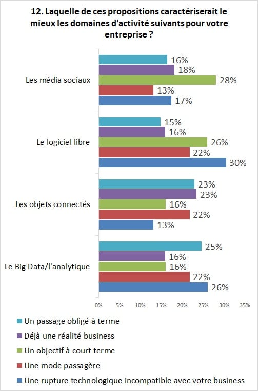 Pour autant, la plupart semblent conscients des enjeux qui se matérialisent autour du Cloud, de l’analytique, des objets connectés du logiciel libre ou des média sociaux. C’est particulièrement évident pour le Cloud qui apparaît désormais comme incontournable pour 6 répondants sur 7 (graphique 11) alors qu’ils étaient encore un tiers à faire part de leur scepticisme il y a quatre ans.