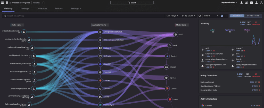 Falcon AIDR cartographie les relations entre utilisateurs, invites, modèles, agents et serveurs MCP (cf. illustration). Il vise ainsi à apporter une visibilité complète sur l’utilisation de l’IA par les employés, prévenir les interactions IA risquées et protéger les données sensibles contre l’accès aux systèmes d’IA externes.