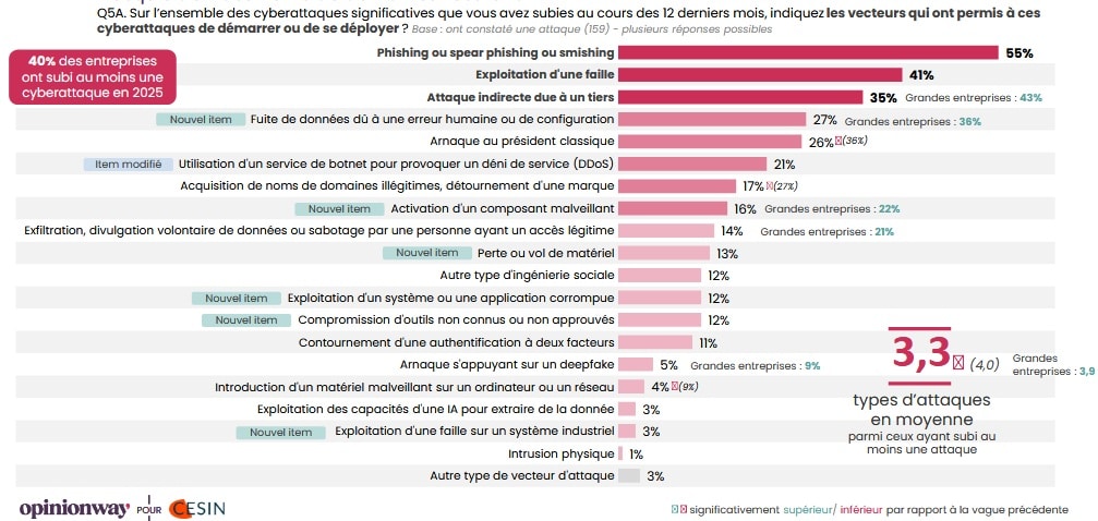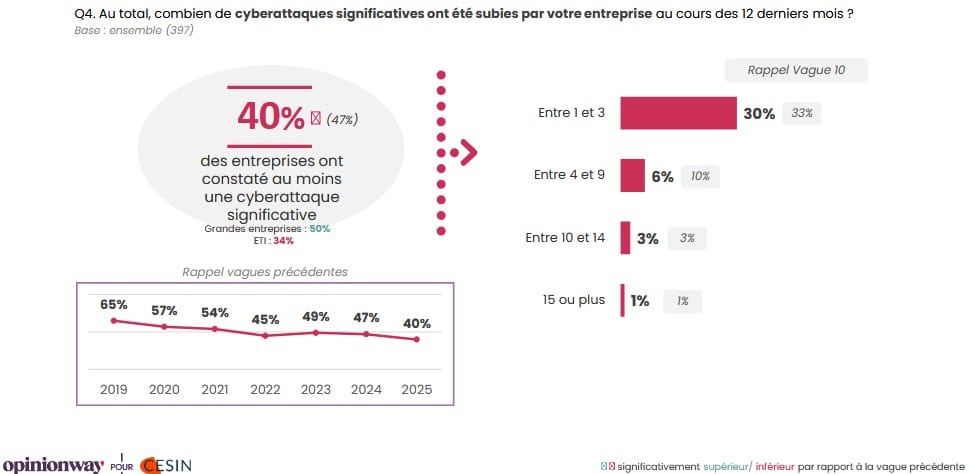 En 2025, 40 % des entreprises déclarent avoir subi au moins une cyberattaque significative, un chiffre en baisse continue depuis plusieurs années, même si les grandes entreprises restent les plus exposées (50%).