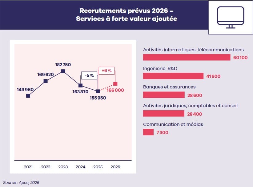 Pour les activités informatiques et télécoms, l’Apec prévoit 60.100 recrutements de cadres en 2026, soit une progression de 5% sur un an. C’est un retour à la hausse après un exercice 2025 encore orienté à la baisse dans les activités informatiques (-4%), dans un contexte d’investissement atone. L’informatique resterait ainsi l’un des principaux moteurs de la reprise attendue dans les services à forte valeur ajoutée, aux côtés de l’ingénierie-R&D et du conseil.