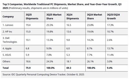 Le marché mondial du PC mondial a retrouvé de la vigueur au troisième trimestre 2025, avec des livraisons atteignant 75,8 millions d’unités, soit une hausse de 9,4% par rapport à l’année précédente, selon les dernières données d’IDC. Après avoir été au creux de la vague jusqu’à l’an dernier, le marché est tiré par une vague de renouvellement du parc installé, liée notamment à la fin programmée du support de Windows 10.