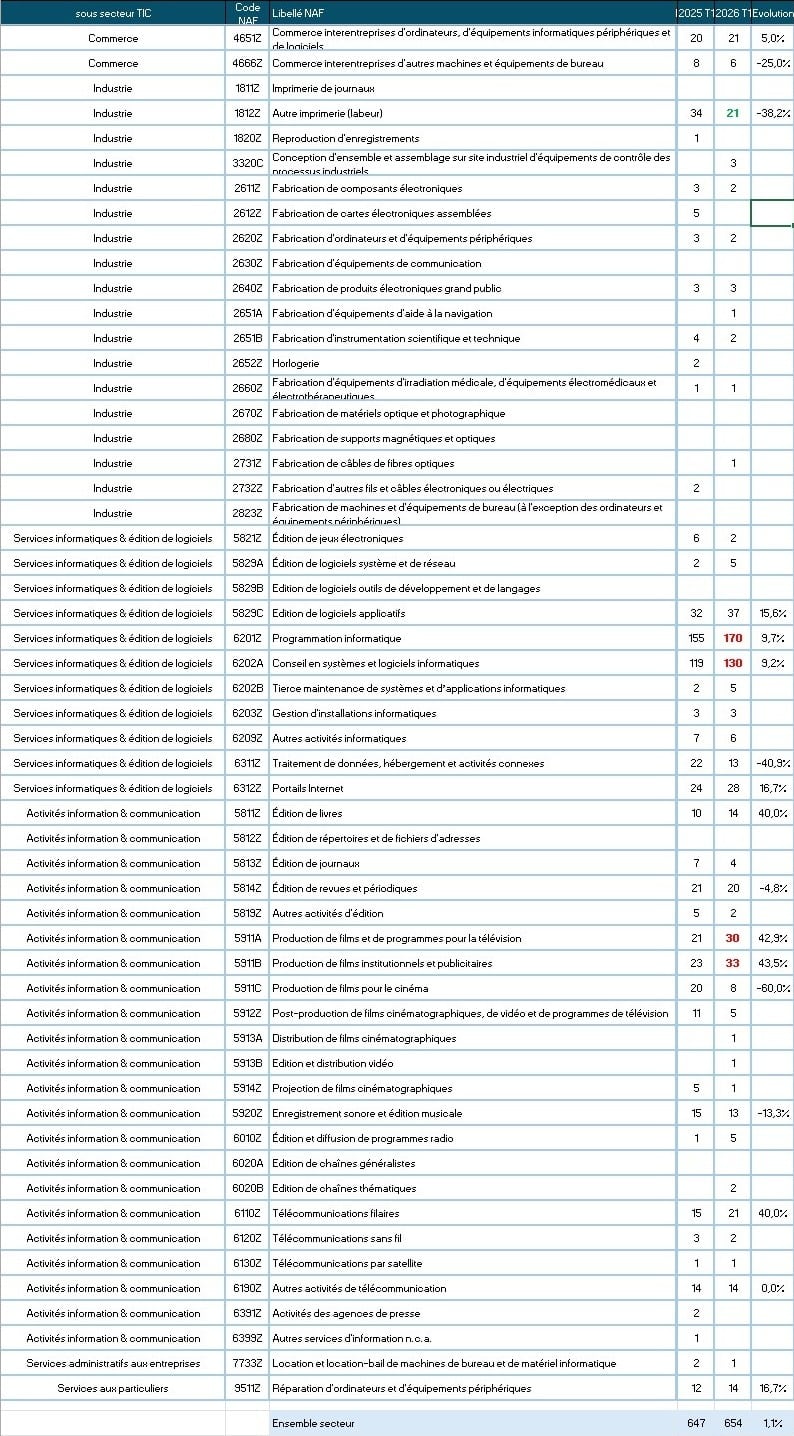 La fragilité reste d’abord celle des plus petites structures. Au niveau national, les microentreprises de moins de trois salariés concentrent 75 % des procédures ouvertes, avec 14 311 défaillances sur le trimestre (+11,2 %). Dans les TIC, la logique est proche : les entreprises de moins de trois salariés représentent 69 % des défauts du secteur, signe que la pression se concentre d’abord sur les acteurs les moins capitalisés et les plus exposés aux à-coups de trésorerie.