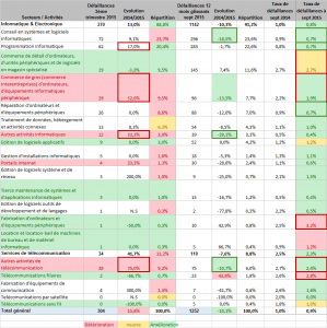 Les entreprises IT ayant fait l’objet d’une procédure collective au troisième trimestre 2015 (tableau ci-dessus): Polymont It Services ; Ftmg France ; 2 Hard ; Avro Tech ; AMR Services (Assistance Maintenance Réseau et Services) ; APGI Accompagnement Pour La Gestion Informatique Distribution et Services ; Synergie Informatique ; Vertical Connect ; Dynatera ; Axcenit ; Services Tertiaires aux Entreprises des Pyrénées – Step : C ; Zen-Ip ; Hinnoya ; Fitcom ; E S E Sarl.