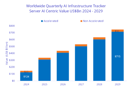 Les serveurs représentent 98 % des dépenses, avec une progression annualisée de 173,2% au dernier trimestre. Le segment des serveurs avec accélérateur intégré (GPU) représente 91,8% des dépenses, avec une croissance de 207,3% d’une année sur l’autre. Leur part devrait grimper à plus de 95 % des dépenses d’ici 2029, avec une croissance moyenne de 42% sur les 5 prochaines années.