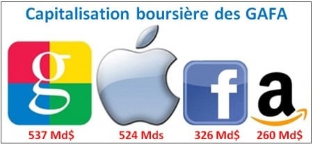 Le GAFA représente aujourd’hui une capitalisation cumulée de 1650 milliards de dollars.Capitalisation boursière des GAFA Un chiffre qu’il faut comparer à un autre pour en comprendre sa signification, son importance. La capitalisation du CAC40 – qui regroupe 40 très grandes entreprises françaises – est de l’ordre de 1170 Md€ soit 1275 milliards de dollars. La puissance de ce groupe des GAFA ne semble pas connaître de limites.