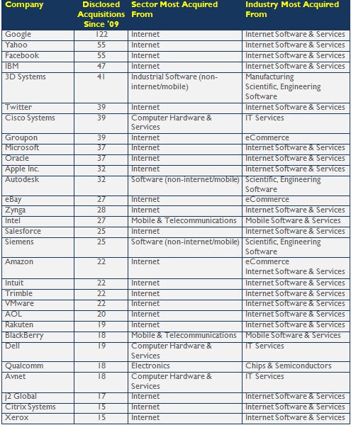 Sur l’ensemble des entreprises, c’est Google qui est le champion toutes catégories – de très loin – avec 122 acquisitions depuis 2009 (183 depuis 2001) devant Yahoo et Facebook (55 acquisitions chacune). L’acquisition la plus importante – celle de Motorola Mobility – pour un montant de 12,5 milliards de dollars a certainement été la plus malheureuse. Le constructeur des mobiles a été revendu 2 ans plus tard pour moins de 3 milliards de dollars soit une perte sèche de près de 10 milliards de dollars. Parmi les autres acquisitions significatives, on peut mentionner Nest Labs (3,2 mds$) et Waze (près de 1 md$). Dassault est la seule société française dans ce classement avec 14 acquisitions depuis 2009.
