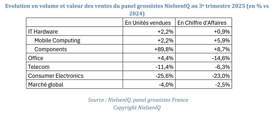 Le syndicat français des grossistes informatiques (SGI) publie en partenariat avec le cabinet d’études NielsenIQ (GFK) les chiffres du panel grossistes de ce dernier pour le 3e trimestre 2025. Le marché dans son ensemble reste en recul avec une baisse du chiffre d’affaires de 2,5% d’une année sur l’autre et de 4% en volume. Mais une embellie se dessine après un premier semestre où l’activité avait plongé de plus de 25% en volume et de 12% en valeur.