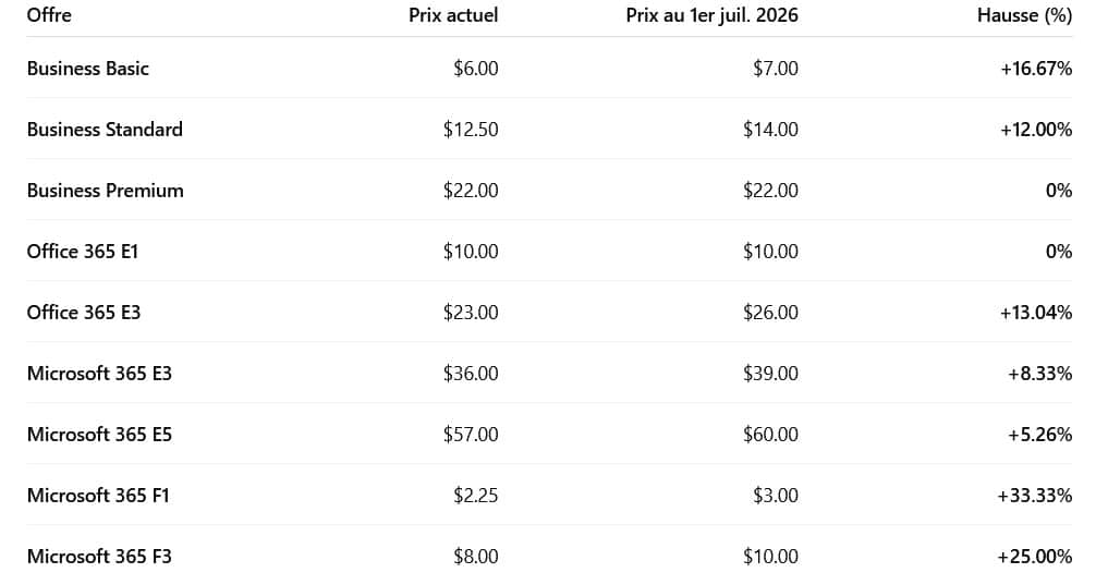 Microsoft a annoncé jeudi une nouvelle augmentation des prix de Microsoft 365 pour les entreprises et les clients gouvernementaux, qui prendra effet au niveau mondial le 1er juillet 2026. Les ajustements varient fortement selon les versions (voir tableau ci-dessous). Le tarif de la suite Office 365 E1 reste par exemple inchangé mais celui de Microsoft 365 Business Basic grimpe de 16,7% et Microsoft 365 F1, la version destinée aux travailleurs de première ligne, enregistre la plus forte progression avec une hausse de 33%.