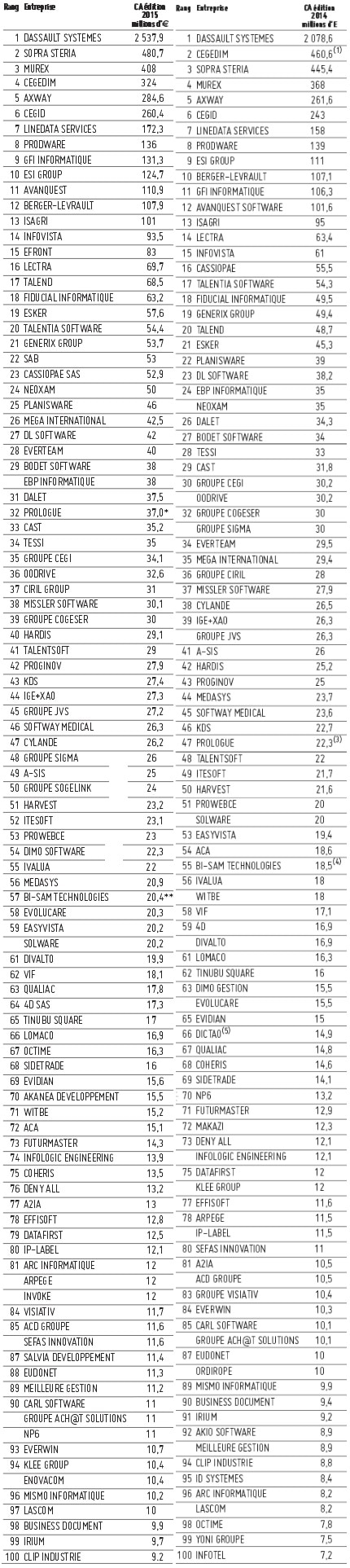 Dassault Systèmes, qui représente 33,7% du chiffre d’affaires, conserve sa première place. L’éditeur de solutions 3D est suivi par le nouveau groupe Sopra-Steria qui devance Murex. Cegedim précédemment deuxième du classement, descend au 4ème rang suite à la vente de sa division « CRM et données stratégiques » à IMS Health. Axway conserve la 5ème place.