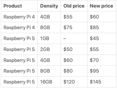 Le modèle 2 Go de la gamme Pi 5 passe de 55 dollars à 60 dollars ; la version 16 Go passe de 120 dollars à 145 dollars. Certains modèles de Raspberry Pi 4 sont également concernés par les hausses de prix : la version 4 Go augmente de 5 dollars pour atteindre 60 dollars et la version 8 Go passe de 75 à 85 dollars. Le Compute Module 5 de 16 Go voit également son prix augmenter de 20 dollars.