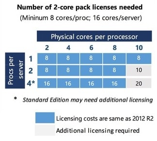 Pour Wes Miller, un analyste de Directions on Microsoft ayant réalisé une étude sur la politique tarifaire de Microsoft, cité par ComputerWorld, au-delà de 8 cœurs par processeur, le prix va grimper. De même, il sera plus élevé pour les petites configurations, puisqu’il sera nécessaire de souscrire a minima des licences de 16 cœurs par serveur. Ce que réfute Microsoft, qui explique, tableau à l’appui (voir ci-contre), dans une FAQ dédiée, à ce sujet que le prix ne changera que pour les serveurs à deux ou quatre processeurs de plus de 8 cœurs chacun.